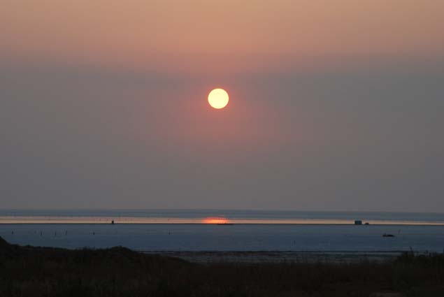 巴斯昆恰克鹽湖的朝陽(蔡波拍攝)"]