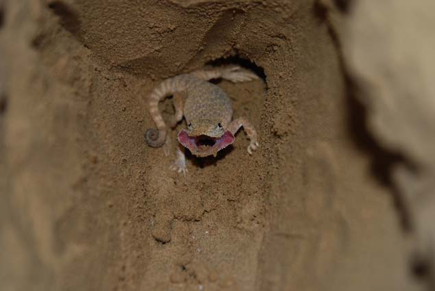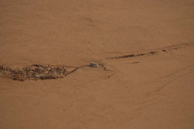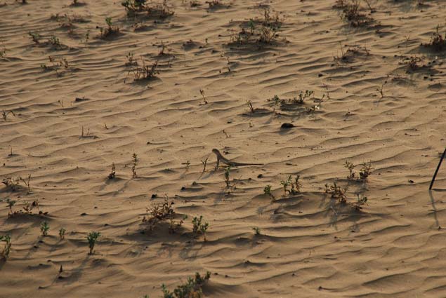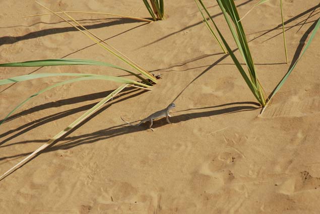 我們?cè)诓贿h(yuǎn)處一片沙漠發(fā)現(xiàn)了一種很特別的蜥蜴——大耳沙蜥。它個(gè)頭大、鼻孔朝天、胖乎乎的,腳趾上長著毛一般的鱗片,方便其在沙粒上奔跑。這小東西發(fā)怒時(shí),會(huì)張開腮幫子,就像兩只大耳朵——那可真是“嘴巴咧到耳后根”。滾燙沙漠的地面溫度早已超過五十度,但這絲毫不影響大耳沙蜥的活躍。它們的行為也很特別,外出活動(dòng)時(shí)不喜歡草叢,只喜歡沙地,發(fā)現(xiàn)了危險(xiǎn),就踮著腳急速奔跑,然后突然停下回頭探看敵情。一旦離開天敵視線,它就晃晃身子,迅速藏進(jìn)沙堆里一動(dòng)不動(dòng)。有時(shí)候隱藏得不好,會(huì)露出尾巴,甚至還露出腦袋——搞笑的是,它還以為自己隱藏很好,繼續(xù)一動(dòng)不動(dòng)。而如果奔逃和躲藏都沒能擺脫敵人,它就會(huì)突然轉(zhuǎn)過身,張開大嘴進(jìn)行恐嚇。