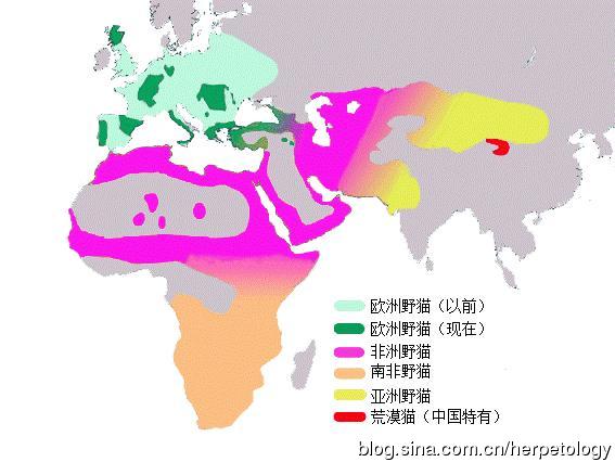 斑貓的五個(gè)野生亞種分布圖,也有說(shuō)荒漠貓是獨(dú)立種(菠菜翻譯整理)