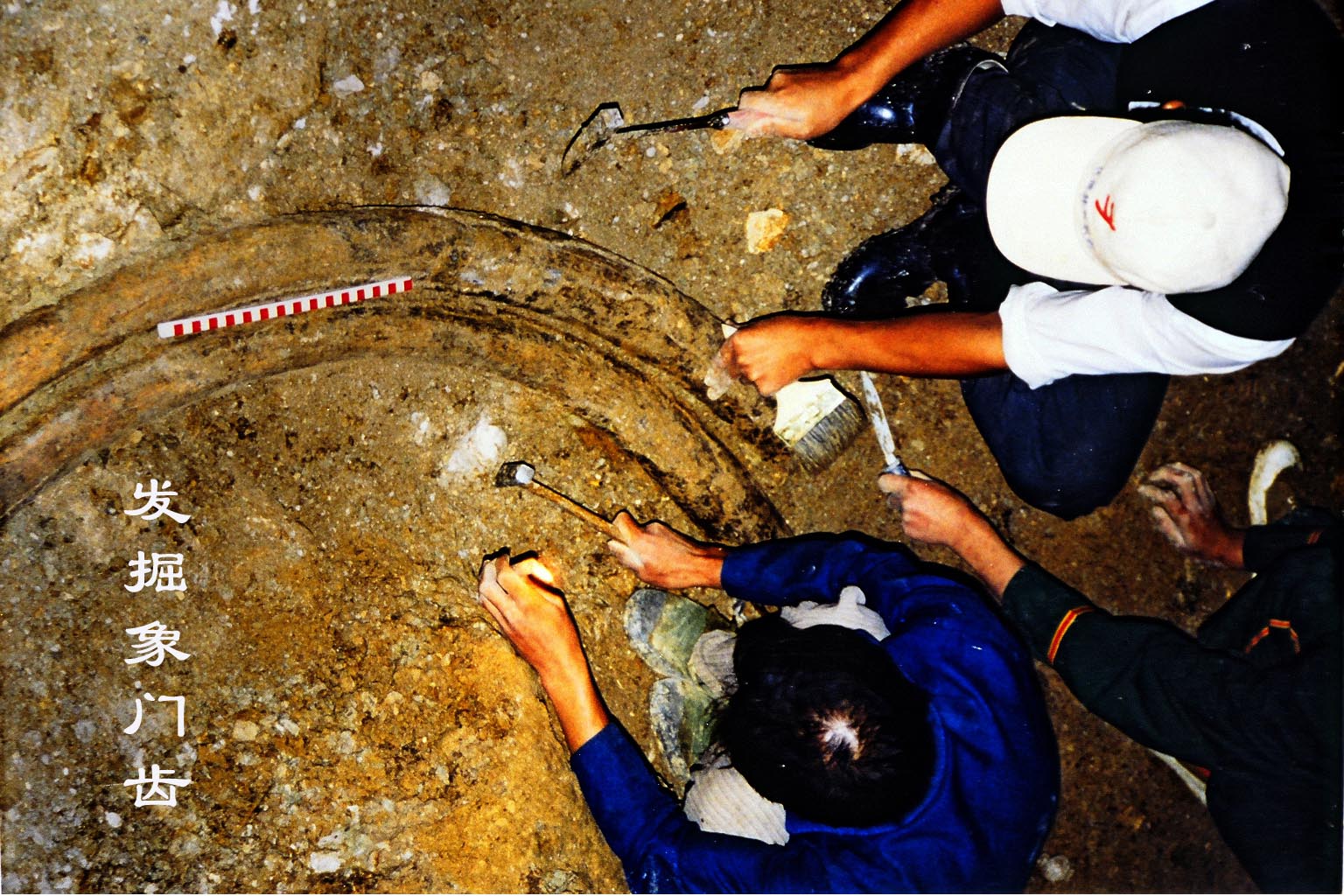 在黃萬波指導下,工作人員經過10多個小時的仔細發(fā)掘,在已露門齒的東北側又出現(xiàn)一門齒根部,而且兩者是緊靠著的。為了完好地將這兩根象門齒取出,發(fā)掘者把E探方和F探方合為一格,并沿著門齒的自然彎曲方向擴大范圍,隨著土層的剝開象門齒露出的長度也越來越長:80厘米、130厘米、170厘米。至180厘米時門齒的直徑急劇縮小,這表明己接近牙尖。1號門齒(野外臨時編號)出土時牙尖缺失,從凹凸不平的斷面形態(tài)和褐黃的染色分折,缺失的牙尖是在埋藏前被折斷的;2號門齒完好無損?,F(xiàn)場測量:1號門齒長189厘米;2號門齒長208厘米。