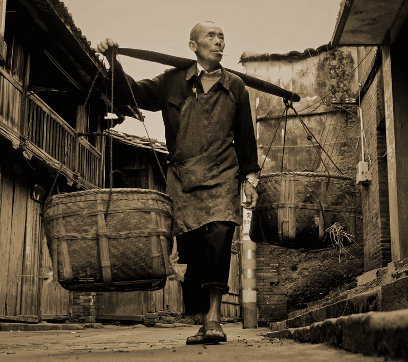 因此,人類在很長的歷史演進(jìn)中,已經(jīng)學(xué)會了在負(fù)重時盡量使脊柱作為支柱來承載。如圖許多人采用頭頂負(fù)重,或者用肩挑負(fù)重,都是使重物的重力大致是沿著脊柱作用,使脊柱作為支柱,只簡單地承受壓力。這種負(fù)重的辦法是很科學(xué)的,它既能夠承受更多的重量,又能夠保護(hù)脊柱不受傷害。