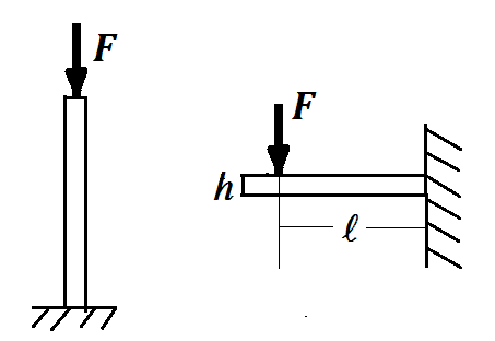 在圖2上,左邊是一個(gè)柱承受的壓力,而右邊是一根懸臂梁。外力F是一樣大。設(shè)這根柱和梁的橫截面都是矩形,其寬度是b高為h,并設(shè)它們都是有同一材料組成的。由材料力學(xué)我們知道,兩種情形,截面上的最大應(yīng)力[ ]可以經(jīng)過(guò)簡(jiǎn)單的計(jì)算得到。