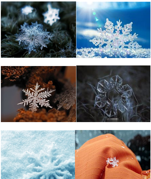 下面我們來(lái)欣賞一下雪花的圖片吧。如此的晶瑩剔透、玉潔冰心,真是令人心醉!怪不得中國(guó)古代詩(shī)人窮盡了不下30種美譽(yù)來(lái)稱呼它:六出,飛花,瓊英,玉蝶,瑞葉,......。的確,每一朵雪花都是大自然造物主的藝術(shù)創(chuàng)作。