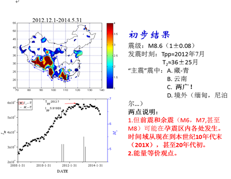 A.2008年中國地震局地震預(yù)測研究所,召開年終地震會商會。尹祥礎(chǔ),張浪平,李文軍,袁帥,張曉濤在題為“大地震前的大時空異?!钡膱蟾嬷惺状翁岢觯骸案鶕?jù)中國大陸LURR的時空演化一個超大地震正在大西南孕育(大西南指從廣東西部,廣西,云南,西藏和青海,四川南部,我們簡稱為大西南),超大地震指8級以上地震。這個孕震區(qū)區(qū)域之大,時間之久(最大線尺度近2000km,孕震時間已有好幾年,但其孕震區(qū)連成一片是從2007年8月左右開始的)。事實(shí)上,該區(qū)域內(nèi),今年已經(jīng)開始有強(qiáng)震連發(fā)的苗頭(四川,云南,西藏…)?!辈⑶医ㄗh“A,建議立項(xiàng)“大西南大地震”課題,組織有關(guān)專家研究、追蹤。B,從LURR的角度,要縮小預(yù)測的時空域,最好能用小時空尺 度作LURR掃描,這就要求提高該區(qū)域的地震監(jiān)測水平” B. 2008年在中國地震局地震預(yù)測研究所編《中國大陸強(qiáng)震趨勢預(yù)測研究-2009年度》發(fā)表我們的論文:尹祥礎(chǔ),張浪平,張永仙,等,2008,大地震前LURR的大時空異?!A(yù)測中國大陸未來大地震的探討(PP144-150),在該文中,我們正式提出“大西南超大地震”。更主要的,在同書中,中國地震局地震預(yù)測研究所,在2009年度中國大陸強(qiáng)震趨勢預(yù)測研究總報告中(PP1-90,),正式確認(rèn)我們的“大西南超大地震”的預(yù)測(P18)。也意味著地震預(yù)測研究所參與預(yù)測了“大西南超大地震” C. 2012年5月29日向中國地震局陳建民局長匯報“大西南超大地震”的預(yù)測。陳建民局長很重視,做了有關(guān)部署,包括: D.2012/6/4,中國地震局監(jiān)測預(yù)報司,召集專門會議,李克司長主持會議,陰朝民副局長(主管地震預(yù)報)蒞臨,地震預(yù)測所,地震臺網(wǎng)中心等單位的領(lǐng)導(dǎo)和專家參加,聽取尹祥礎(chǔ)關(guān)于“大西南超大地震”的預(yù)測,并進(jìn)行了討論,研究。 E.幾年來我們一直在研究和追蹤它。同時向有關(guān)單位和專家求教和交流,并不斷修正我們的預(yù)測。先后20幾次,在國內(nèi)外學(xué)術(shù)會議上交流我們的研究結(jié)果,并發(fā)表論文。列舉如下 學(xué)術(shù)會議 報告(PPT) 1. 向陳建民局長匯報 , 2012/05/29 尼 2. 中國地震局監(jiān)測預(yù)報司關(guān)于西南大地震的專題報告會(報告人,尹祥礎(chǔ)),主管地震預(yù)報的陰朝民副局長,京區(qū)單位的有關(guān)領(lǐng)導(dǎo)和業(yè)務(wù)骨干參加, 2012/6/4, 尼 3. 中國地震局科技司, 2012/06/01 尼 4. SCA 2014,2014/8/21-25,尼 (SCA:全國超算應(yīng)用大會) (在會上報告的PPT中,預(yù)測2015/4/25 M8.1大地震的截圖見圖2)尼 5. 向鄭哲敏先生匯報和求教(2014/03/07 ) 尼 6. 2012/02/24 馬瑾院士邀請到中國地震局地質(zhì)研究所報告 尼 7. 中國地震局地震預(yù)測研究所年終會商會 喜 2013 8. 新疆強(qiáng)震形勢研討會, 2011/09/29 喜 9. 廣東地震局,2009/02/07 尼 10. 云南地震局,2013/5/15 尼 11. 7th ACES Workshop (Japan,2010/10/3-7)(ACES-APEC Cooperation for Earthquake Simulation)( We declared “A super-large earthquake with M8.7 is preparing”) 尼 12. 地震咨詢委員會2014(2014/11/20) 13. SCA,2012(山東,青島)尼 14. 973課題結(jié)題匯報 (北京,2010)(項(xiàng)目名稱: 活動地塊邊界帶的動力過程與強(qiáng)震預(yù)測,課題名稱: 區(qū)域強(qiáng)震活動演化的物理模型和預(yù)測模型試驗(yàn)) 15 中國地震局地震預(yù)測研究所年終會商會 (2012) 16 中國地震局地震預(yù)測研究所年終會商會 2008 17 LNM基金委課題匯報(2012)(丹東) 18 LNM基金委課題匯報(2013)(云南) 19 地震咨詢委員會 2013年會 20 在臺灣中央大學(xué)地球科學(xué)學(xué)院的學(xué)術(shù)報告,2010-12-03,尼 其它 (…) 注:尼(預(yù)測地震地點(diǎn)包括尼泊爾); 喜(預(yù)測地震地點(diǎn)包括喜馬拉雅地震帶 ) 論文 1. 尹祥礎(chǔ), 劉月,2013,加卸載響應(yīng)比-- 地震預(yù)測與力學(xué)的交叉,力學(xué)進(jìn)展,43,555-580 2. Xiang-chu Yin, Yue Liu, Peter Mora, Shuai Yuan, Lang-ping Zhang, 2011, New progress in LURR-integrating with the dimensional method, Pure and Applied Geophysics, 170: 229-236. 3.劉月, 尹祥礎(chǔ), 袁帥, 張浪平. 量綱分析應(yīng)用于地震預(yù)測的探索. 地球物理學(xué)報, 2012, 55(9): 3043-3050. 4. 尹祥礎(chǔ), 劉月,聶寧明,袁帥,張浪平,唐蘭蘭,加卸載響應(yīng)比與量綱分析相結(jié)合——地震預(yù)測的新探索, 《科研信息化技術(shù)與應(yīng)用》,2012 5. Xiang-chu Yin, Yue Liu, Lang- ping Zhang, Load-Unload Response Ratio and its New Progress, in “Imaging, Modeling and Assimilation in Seismology, pp 219-244”, edited by Yong-gang Li, High Education Press and Walter De Gruyter GmbH & Co. KG, Berlin/Boston , 2012 6. 尹祥礎(chǔ), 下一個(中國)大地震,咨詢委通訊,2015 (印刷中). 7. 尹祥礎(chǔ),張浪平,張永仙,等,2008,大地震前LURR的大時空異?!A(yù)測中國大陸未來大地震的探討,中國地震局地震預(yù)測研究所編《中國大陸強(qiáng)震趨勢預(yù)測研究-2009年度》,144-150 8. 中國地震局地震預(yù)測研究所,2009年度中國大陸強(qiáng)震趨勢預(yù)測研究,2008,中國地震局地震預(yù)測研究所編《中國大陸強(qiáng)震趨勢預(yù)測研究-2009年度》,3-90 (18) 9. 劉月2014,加卸載響應(yīng)比在地震預(yù)測中若干問題研究, 中國科學(xué)院力學(xué)研究所博士學(xué)位論文 其中,離4月25日地震最近的報告是上述PPT中的No4和No12,二者內(nèi)容