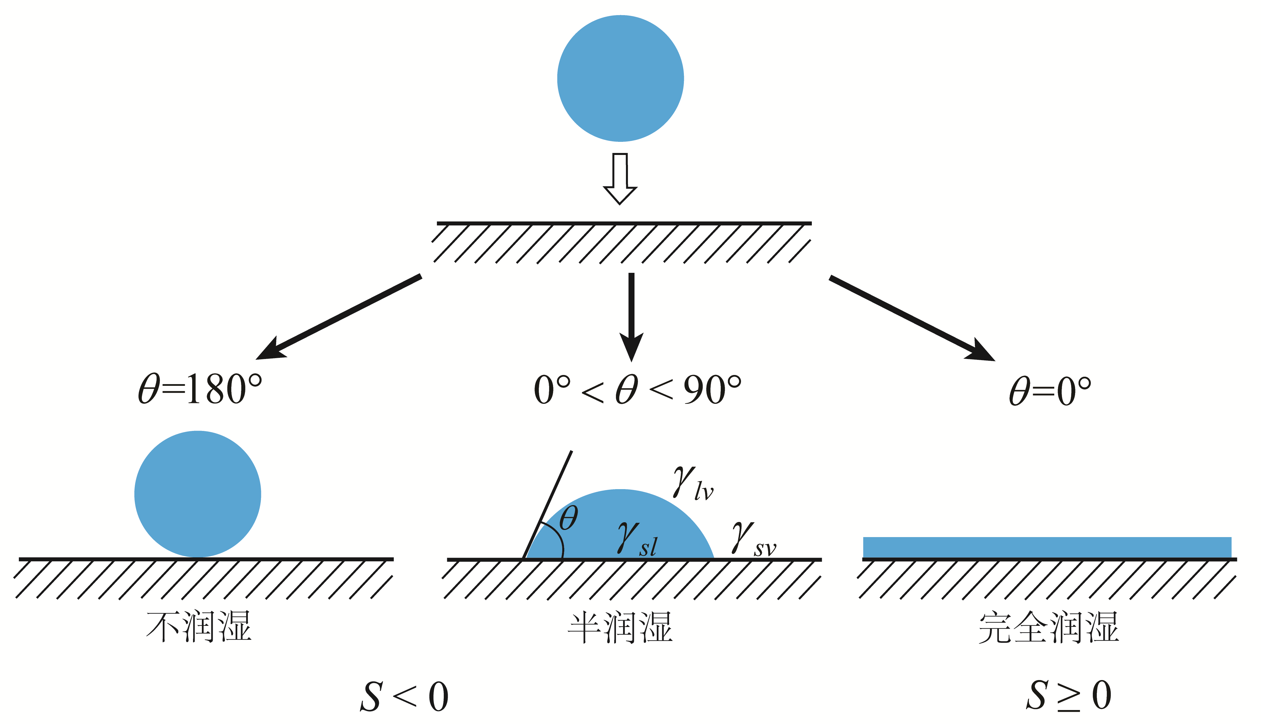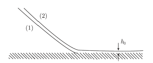 科學(xué)家在處理接觸角時,有兩種不同的途徑,一種是宏觀辦法,另一種是微觀辦法。前者認為固-液-氣三相之間有一條理想的“接觸線”,這條接觸線在液滴鋪展過程中在不斷移動著;后者認為在液滴的前端有一個厚度為 h0 的薄膜,它就是前驅(qū)膜,其厚度只有分子直徑的量級(參見圖1.3)。