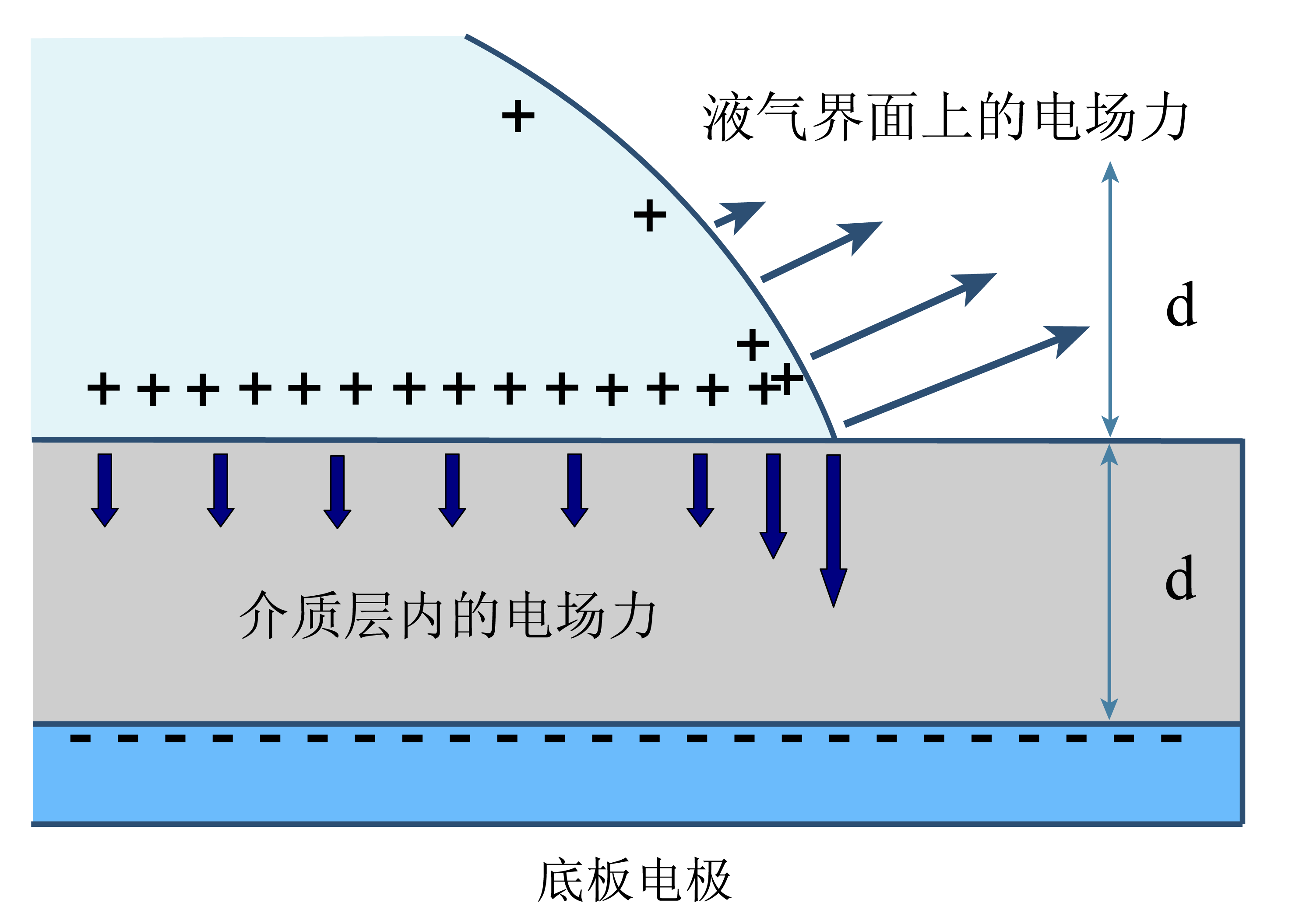 科學(xué)家告訴我們:液滴鋪展的主導(dǎo)力是毛細力。毛細力實質(zhì)是表面張力,液體在豎直細管中爬升就是由液體的表面張力導(dǎo)致的。如果我們研究的液體是電解質(zhì),而且固體介質(zhì)內(nèi)施加有電場,那么液滴鋪展就是電潤濕毛細問題了(參見圖1.4),而沒有電場條件下的鋪展則可稱之為“自由鋪展”。