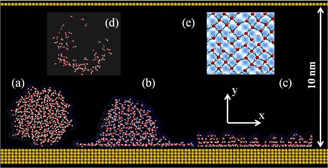 趙亞溥研究團隊利用分子動力學(xué)(MD)方法模擬了親水基底上二維的圓柱形水滴濕潤構(gòu)型(參見圖1.5)。圖1.5a給出的是水滴的初始構(gòu)型,圖1.5b給出的是水滴自由濕潤的構(gòu)型(可以看到這個平衡態(tài)中有前驅(qū)膜存在),圖1.5c給出的是在y方向上存在電場時水滴完全濕潤的構(gòu)型,圖5d示出自由濕潤情況中構(gòu)成前驅(qū)膜的水分子在原始構(gòu)型中的位置,圖5e則是前驅(qū)膜中的二維氫鍵網(wǎng)絡(luò)。這些結(jié)果表明了:前驅(qū)膜的鋪展速度很快,形成前驅(qū)膜的水分子來自液滴表面,在電濕潤情況下前驅(qū)膜顯示出類固體性質(zhì)。