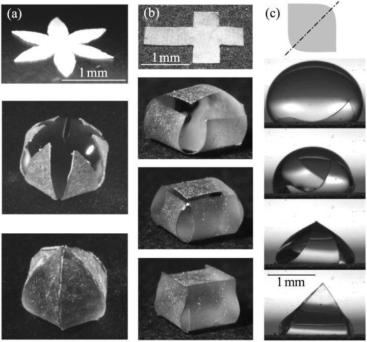 最后,我們來解釋趙亞溥研究團隊所提出的“電彈性毛細(EEC)”概念。在此之前,需要先說明什么是“彈性毛細”?如果液滴是放置在一個彈性薄膜上面,薄膜可能在液滴的液氣界面張力垂直分量的作用下逐漸彎曲并最終將液滴包覆起來(參見圖1.6)。當(dāng)然,這里要求液滴尺寸滿足一定的條件?!白园病痹谖C電系統(tǒng)的器件裝配工藝中有著十分重要的應(yīng)用。