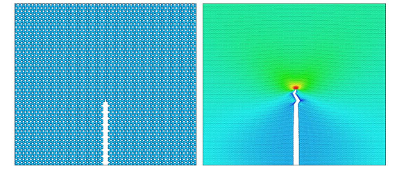 應(yīng)該說明,Griffith理論有其適用范圍。最近,力學(xué)所的研究人員通過原子尺度的模擬與分析,發(fā)現(xiàn)這個理論的適用范圍是10個納米以上的裂紋,小于此尺度的裂紋擴展將沿著Zigzag(非平直路徑)擴展,Griffith 理論將會產(chǎn)生較大誤差。圖2是兩種裂紋擴展路徑的對比。