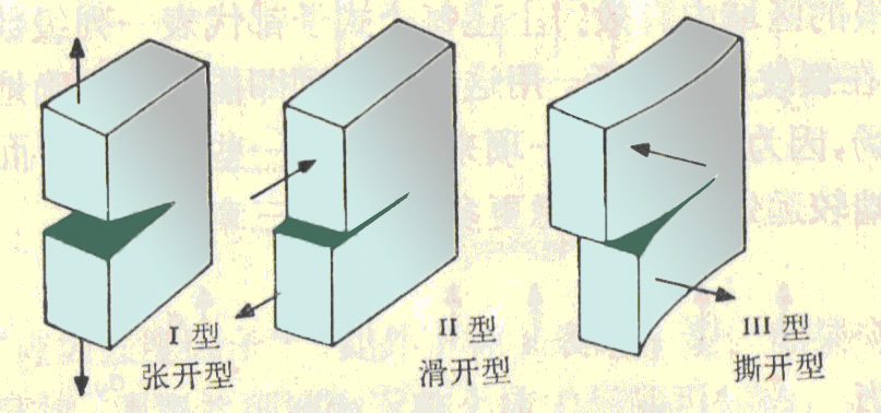 根據(jù)應(yīng)力對裂紋施加的方式不同,可分為三種開裂型式,如圖3所示。所以,對應(yīng)于三種開裂型式,它們分別為張開型、滑開型和撕開型。與之相應(yīng),有三個斷裂強度因子:。進行這三類不同斷裂型式的試驗,便可測得對應(yīng)的臨界應(yīng)力強度因子:。