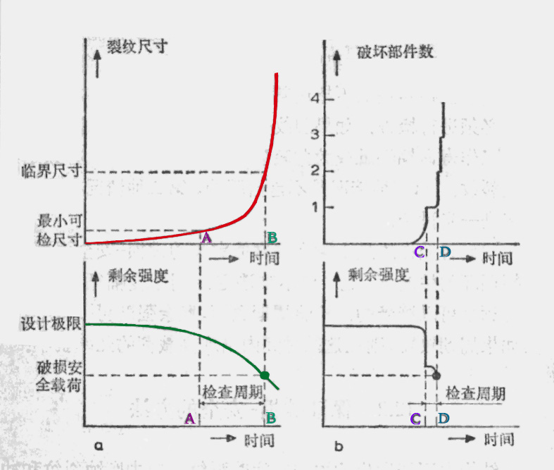 圖7a是典型的裂紋隨時間擴展曲線。圖7b中則給出了材料剩余強度隨疲勞過程的變化曲線。因此,從裂紋萌生到材料破壞之間的時間區(qū)間,是一個可以對構(gòu)件進行檢查并防止事故發(fā)生的區(qū)間。