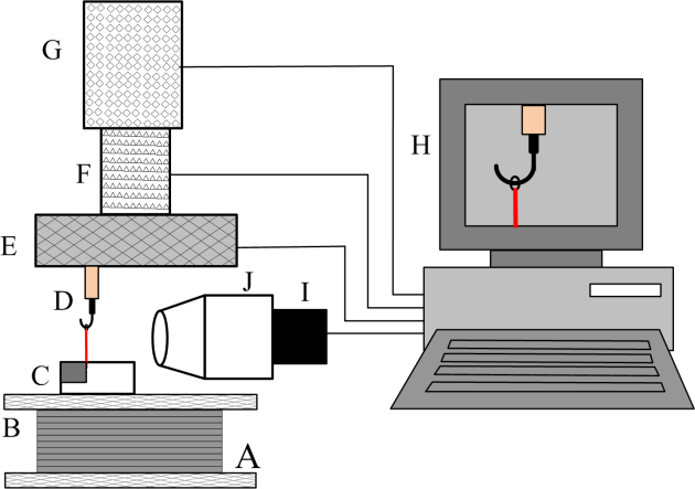 圖1 生物微樣品力學加載實驗系統(tǒng)原理圖 (A) 防震臺;(B) XY軸微米定位平臺; (C) 多功能夾具;(D) 纖維絲; (E) 微力傳感器; (F) 壓電陶瓷促動器;(G) 直線電機驅(qū)動器; (H) 顯微成像系統(tǒng);(I) CCD攝像機; (J) 高倍放大變焦鏡頭。