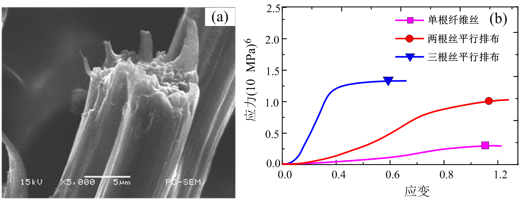 圖3 PLGA微米絲斷口形貌的掃描電鏡圖片及微米絲的力學性能曲線 (a) PLGA微米絲斷口形貌的掃描電鏡圖片;(b) 單根微米絲在不同排布方式下的力學性能曲線