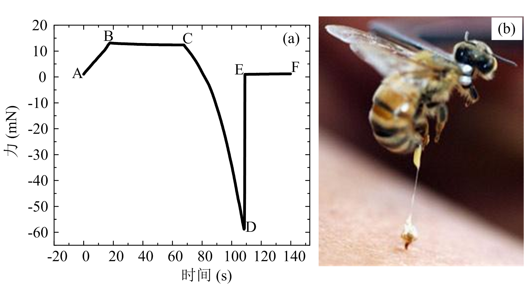 第二個例子是日常生活中常見的蜜蜂蜂針蟄刺的力學測試。眾所周知,蜜蜂尾部的蜂針可以蜇人,而人類利用蜜蜂蜂針做為針具,循經(jīng)絡(luò)皮部和穴位施行不同手法的針刺,蜂針產(chǎn)生的蜂毒可以止痛,治療風濕、類風濕、神經(jīng)痛等疾病。據(jù)發(fā)現(xiàn)蜜蜂蜂針長度只有0.6-1.2cm長,而且蜂針是連著蜜蜂內(nèi)臟的,當它蜇人之后蜂針會連同內(nèi)臟一起被拔出,因此蜜蜂蜇人后會立刻死亡。既然蜂針蜇人后自己需要付出生命之代價以及其產(chǎn)生的蜂毒具有治療疾病的效果,那么我們就會好奇蜂針蟄刺皮膚的力學過程是怎樣的?以及我們?nèi)绾尾拍軝z測蜜蜂蜂針蟄刺皮膚所用力之大小呢?鑒于此,本團隊計劃利用生物微小樣品力學加載測試系統(tǒng)來嘗試。具體實驗方法是:首先用鑷子固定蜜蜂身體并讓其蟄刺乳膠手套,待蜜蜂釋放蜂針準備蟄刺時,立即將蜜蜂提起,隨后蜂針即可留在乳膠手套中,見圖4即為蜂針拔出過程以及蜂針在刺入或拔出過程中力與時間曲線圖。如圖4 (a)所示,A-B段即為蜂針在穿刺過程中所受的力,而且穿刺力會隨著穿刺時間的增加而增大,穿刺力最大可達到將近15mN;B-C段則是蜂針在拔出過程中會因為乳膠的彈性形變的原因,短時間內(nèi)的拔出力是不會發(fā)生變化的;而C-D段則顯示拔出力最大可將近60mN,其遠遠大于穿刺力,導(dǎo)致此現(xiàn)象的原因是受到蜂針倒刺的影響,這也是蜜蜂蟄刺人之后需要付出生命之代價的原因;D-E段顯示蜂針全部從乳膠中拔出來;E-F段顯示蜂針從乳膠中拔出后,此時力為零。