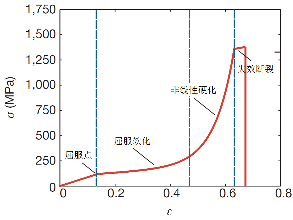 2 蜘蛛絲獨(dú)特的J型應(yīng)力應(yīng)變曲線 說到材料的應(yīng)力應(yīng)變曲線,自然要說到胡克定律。1678年,胡克指出“任何彈簧受力與伸長成比例,即:一份力引起拉伸或彎曲一個(gè)單位,兩份力將引起拉伸或彎曲兩個(gè)單位,三份力將引起拉伸或彎曲三個(gè)單位,如此類推?!?老亮[4]指出我國春秋時(shí)期古籍就有“量其力,有三均,均者三,謂之九和?!睎|漢著名注釋家鄭玄(127~200)注釋:“假令弓力勝三石,引之中三尺,弛其弦,以繩緩擐之,每加一石,則張一尺。”即使從鄭玄算起,對力與變形線性關(guān)系的論述也比胡克早了1500年,因而老亮主張將胡克定理改稱為鄭玄-胡克定理。 武際可[5]作了更深入的考證,并對我國科學(xué)技術(shù)落后的根源進(jìn)行了反思:雖然發(fā)現(xiàn)了彈性物體力與變形的線性規(guī)律比胡克早了1500多年,但是后來近兩千年沒有能再前進(jìn)一步,而西方在胡克的基礎(chǔ)上,不斷精確化,開拓應(yīng)用范圍,形成了龐大的近代科學(xué)的一個(gè)分支——固體力學(xué)體系。 圖2a是蜘蛛曳絲的獨(dú)特J形曲線[3],可分為線彈性、軟化,非線性硬化,失效拉斷四個(gè)階段。普通材料的應(yīng)力應(yīng)變曲線有兩個(gè)典型模型,即圖2b的線彈性模型和圖2c的理想彈塑性模型。為了比較的方便,設(shè)三種應(yīng)力應(yīng)變曲線的極限應(yīng)力相同,并且在圖2b和c中也畫出了蜘蛛曳絲的J形曲線。下一節(jié)我們介紹這種J形曲線如何能打造出超級網(wǎng)。
