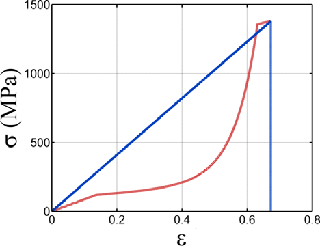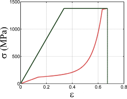 (a) 蜘蛛曳絲的應(yīng)力應(yīng)變曲線 (b) 線彈性模型與蜘蛛曳絲應(yīng)力應(yīng)變曲線對照 (c) 理想彈塑性模型與蜘蛛曳絲應(yīng)力應(yīng)變曲線對照 圖2 蜘蛛絲與材料的典型應(yīng)力應(yīng)變曲線