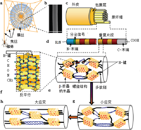 接下來是人類工程見不到的奇景了。再向下走一個尺度臺階,見圖1d,原纖維的結(jié)構(gòu)呈現(xiàn)了:兩種重復的蛋白質(zhì),并分別由氨基和羧基在兩端處結(jié)束。繼續(xù)向下走,到了納米尺度——蜘蛛絲內(nèi)部分級結(jié)構(gòu)的華彩尺度臺階(圖1e):蛋白質(zhì)的 -折疊納米晶體(以下簡稱為折疊納米晶)由蛋白質(zhì)無定形-螺旋結(jié)構(gòu)和 -轉(zhuǎn)角多肽鏈連接(以下簡稱為蛋白質(zhì)鏈)。再下臺階到圖1f,見到折疊納米晶由弱的化學鍵氫鍵(H-鍵)連接。蛋白質(zhì)鏈也有氫鍵以保持小變形時不松開。下一節(jié)我們就在尺度臺階e觀賞蜘蛛絲無與倫比的高強度與高延伸率完美結(jié)合的跨尺度力學奧秘。