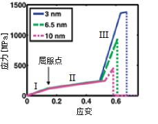 圖3的第III階段有3條線。最上一條線對應(yīng)于蜘蛛正常吐的絲,折疊納米晶長3納米。下面兩條線分別假定了折疊納米晶長6.5和10納米。這三條線所揭示的納米尺度效應(yīng)將在下一節(jié)討論。