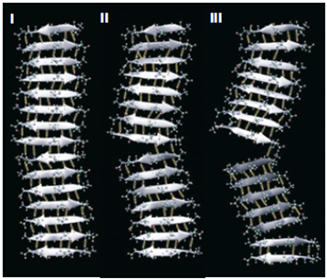 [5]根據(jù)圖2e-f蛋白質(zhì)鏈對折疊納米晶體的作用力,建立了圖4的受力模型:上下端被約束,中部受蛋白質(zhì)鏈向左的橫向力。力學計算表明,圖4a長晶的破壞是彎曲主導的折斷,晶體中部左側(cè)氫鍵在彎折中被拉裂,屬于脆性斷裂,極限載荷小。圖4b短晶則屬于剪切滑動破壞,晶片在粘滑拔出過程中的阻力大大提高了承載能力。對于從3到10納米三種長度的折疊納米晶的計算結(jié)果已經(jīng)由圖3表示。