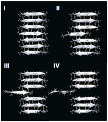 【4】的分段線性簡化曲線,真實曲線在第II和III階段是曲線)。 當拉力增大到某個臨界值時,蛋白質(zhì)鏈纏結(jié)的氫鍵斷開,鏈開始被拉直,宏觀現(xiàn)象是蜘蛛絲屈服,彈性模量突降,見圖3第II階段。這個階段絲可以伸展很長,圖2e到圖2g再到圖2h說明了蜘蛛絲具有大延展性的原理:當基體中的蛋白質(zhì)鏈展開。當?shù)鞍踪|(zhì)鏈充分展開后(見圖2h),蜘蛛絲的大變形階段結(jié)束,彈性模量急劇增加,進入圖3第III階段,即硬化階段。最后折疊納米晶破壞,蜘蛛絲被拉斷。