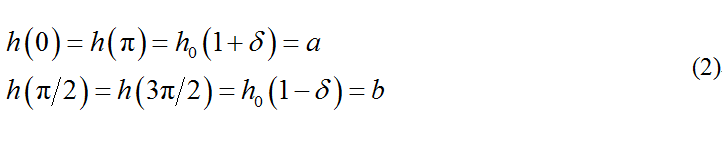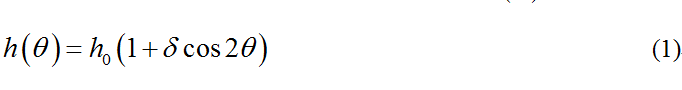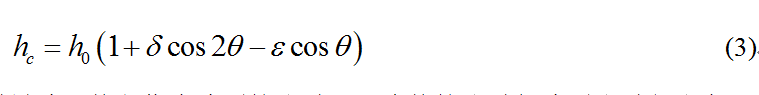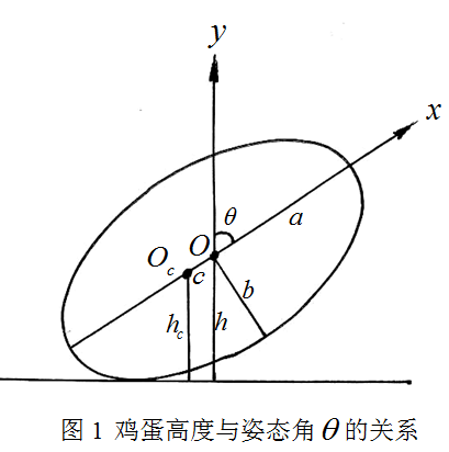 討論這個問題的關(guān)鍵是要對雞蛋的幾何形狀作出適當(dāng)?shù)臄?shù)學(xué)描述。因?yàn)殡u蛋傾斜時接觸點(diǎn)沿蛋殼移動的規(guī)律完全取決于蛋殼的外形。將蛋殼視為長短半軸為和的旋轉(zhuǎn)橢球曲面。先將雞蛋的尖端豎在臺面上(用手扶住不讓它倒下),慢慢轉(zhuǎn)動,直到它的側(cè)面與臺面接觸,雞蛋的幾何中心距臺面的高度必不斷減小。如繼續(xù)朝原方向轉(zhuǎn)動,點(diǎn)的高度又開始增大直至鈍頭與臺面接觸。將雞蛋的尖端至鈍端的對稱軸記為軸,其相對垂直軸的角度記為,則點(diǎn)高度隨角先減小后增大的變化規(guī)律可用函數(shù)近似地表示為