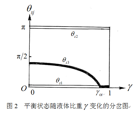 就水的情況而言,因遠(yuǎn)小于,條件(7)必能自動滿足,接近且稍小于。如增大液體的比重,則隨的增大,即隨液體比重的增大而減小,鈍端趨于向上抬起。在的臨界情形,而與豎直狀態(tài)的完全重合。如,因不滿足條件(7),非平凡解即不復(fù)存在。