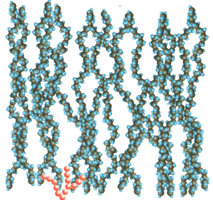 直到1839年,美國(guó)人固特異發(fā)明了橡膠硫化處理技術(shù),才使橡膠成為堅(jiān)固耐用的材料。橡膠的硫化是一種極其微弱的化學(xué)反應(yīng),天然橡膠的每200個(gè)碳原子中,只有1個(gè)原子與硫發(fā)生反應(yīng)(圖4)。盡管化學(xué)作用如此微弱,卻足以使物質(zhì)的物理性質(zhì)發(fā)生從液態(tài)到固態(tài)的巨大變化,膠汁變成了橡膠。這證明:有些物質(zhì)會(huì)因微弱的作用而改變狀態(tài)。于是橡膠就成了一個(gè)實(shí)現(xiàn)工業(yè)化生產(chǎn)的聚合物??諝庵械难蹩墒瓜鹉z長(zhǎng)鏈分子斷裂,而與氧同族的硫元素僅僅比氧的化學(xué)活性略差一點(diǎn),卻使長(zhǎng)鏈分子結(jié)合得更好,這就是軟物質(zhì)的一個(gè)奇異特性:弱力引起強(qiáng)變化反應(yīng)。