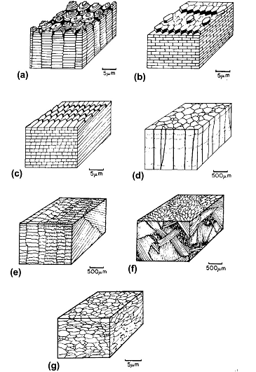 圖4. 貝殼的7類微結(jié)構(gòu):(a)柱狀珍珠母文石,(b)片狀珍珠母文石,(c) 簇葉狀方解石,(d) 棱柱文石或方解石,(e)交叉層狀文石,(f)復(fù)雜交叉層狀文石,(g)均勻分布。其中文石和方解石是碳酸鈣的不同晶體形式