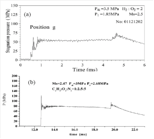從物理上來看,爆轟驅(qū)動(dòng)激波風(fēng)洞運(yùn)行界面縫合技術(shù)實(shí)質(zhì)是一個(gè)驅(qū)動(dòng)氣體與試驗(yàn)氣體聲阻抗匹配的問題,要使得反射波與接觸面相遇時(shí)完全透視。所以,對(duì)于界面縫合條件的解決策略,可以考慮兩個(gè)方面:(1)對(duì)于不同試驗(yàn)狀態(tài),調(diào)節(jié)驅(qū)動(dòng)氣體組分,改變爆轟后燃?xì)馕镄詤?shù),以期控制聲阻抗;(2)利用定常/非定常膨脹的結(jié)合,改變爆轟后的燃?xì)鉁囟?,以期調(diào)整聲速。 ? 對(duì)于策略1,LHD進(jìn)行了不同組分和不同配比的試驗(yàn),包括采用氫氧混合氣體(H2:O2=2:1)和乙炔/空氣混合氣體(C2H2:O2:N2=1:2.5:5)。圖2給出了試驗(yàn)結(jié)果,它們表明:在相應(yīng)的實(shí)驗(yàn)條件下(參見圖中所示),應(yīng)用乙炔/空氣混合氣體可以比應(yīng)用氫氧混合氣體獲得更長(zhǎng)的有效試驗(yàn)時(shí)間,即前者約為7毫秒而后者約為4毫秒。而且,前者獲得的試驗(yàn)氣流具有更高的雷諾數(shù)(約為4108/米),因而應(yīng)用乙炔/空氣混合產(chǎn)生爆轟在進(jìn)行高雷諾數(shù)的氣動(dòng)試驗(yàn)方面具有更明顯的優(yōu)勢(shì)。圖2 爆轟氣體的組分與配比對(duì)駐室壓力平穩(wěn)性的影響