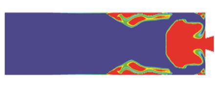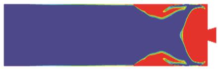 關(guān)于激波-邊界層干擾問題,其物理機(jī)制在于:由于邊界層內(nèi)外的流動(dòng)速度不同,會(huì)在氣流內(nèi)導(dǎo)致三激波結(jié)構(gòu);此外,激波與邊界層作用會(huì)誘導(dǎo)邊界層分離,從而導(dǎo)致驅(qū)動(dòng)氣體與試驗(yàn)氣體的摻混。圖6給出在三個(gè)相繼的時(shí)刻,激波風(fēng)洞中氣體的組分分布情況,其中藍(lán)色表示驅(qū)動(dòng)氣體的質(zhì)量分?jǐn)?shù),紅色則表示試驗(yàn)氣體的質(zhì)量分?jǐn)?shù)。這個(gè)數(shù)值模擬結(jié)果表明了試驗(yàn)氣體的確被污染了。圖6 激波風(fēng)洞中試驗(yàn)氣體被污染的過程
