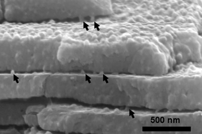圖3 由珍珠母層橫斷面觀測到的礦物橋(箭頭處)