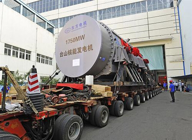 9. 世界最大單機容量核能發(fā)電機研制成功 8月24日上午,目前世界最大單機容量核能發(fā)電機——臺山核電站1號1750兆瓦核能發(fā)電機由中國東方電氣集團東方電機有限公司完成制造,并從四川德陽市順利發(fā)運。臺山核電站是我國首座、世界第三座采用EPR三代核電技術建設的大型商用核電站。東方電機為臺山核電站提供首期全部兩臺核能發(fā)電機,單機容量高達1750兆瓦,是東方電機迄今為止制造的技術難度最高、結構最復雜、體積最大、重量最重的核能發(fā)電機。東方電機開發(fā)設計了轉(zhuǎn)子線圈裝配新工藝、定子線棒制造新工藝、護環(huán)裝配新工藝、油密封系統(tǒng)裝配新工藝等一系列創(chuàng)新成果。