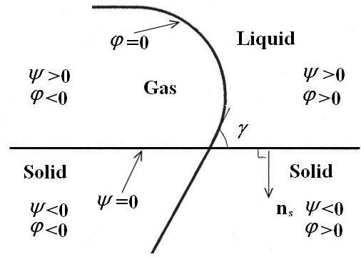 Level?Set?Method)捕捉氣(Gas)液(Liquid)固(Solid)三相界面(參見圖4),有效地實現了拓撲結構變化,即界面變形,其中, , 對應兩個水平集函數, =