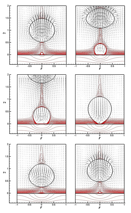 6為在單個典型周期中,氣泡的拓撲結構(由細實線示出)、溫度場(紅色等溫線表示)及流場(由帶箭頭的矢量表示速度)的演變,從上至下、由左到右表示不同的時間順序。其中,固壁材質為鎳(