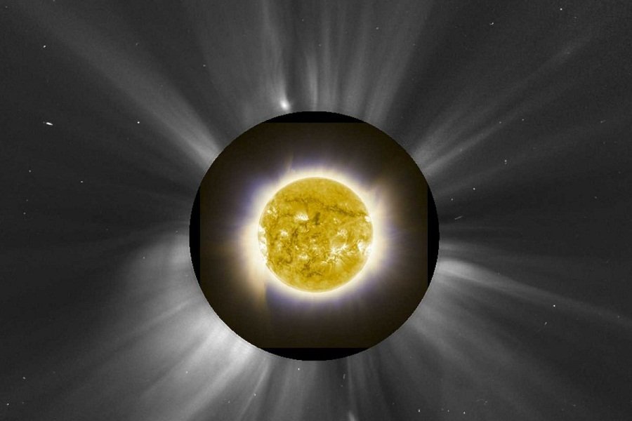 這張合成照片拍攝于11月份的一場日食,太陽藏身在月球背后,我們可以觀察到太陽日冕層噴射出的帶電粒子流。