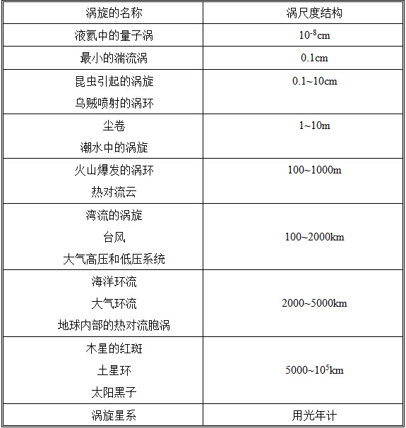 在流體運(yùn)動中存在著各種各樣的渦旋,從流體力學(xué)家H.J.Lugt 總結(jié)的各種渦旋的尺度譜表中,可見宇宙空間的渦旋星系,是大自然中尺度最大的渦旋,其尺度是“光年”。