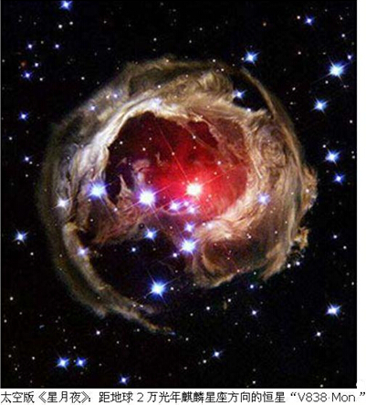 有趣的是,在梵高《星月夜》問世115年之后,美國宇航局和歐洲航天局2004年3月4日在公布“哈勃”太空望遠(yuǎn)鏡新拍攝的一張照片時稱,這幅太空攝影作品與梵高的名作《星月夜》有“異常相似”之處?!肮毙屡牡倪@張照片,反映的是一顆遙遠(yuǎn)恒星周圍的景象。這顆名為“V838 Mon”的恒星位于麒麟星座方向,距離地球2萬光年。在照片上可以看到恒星周圍渦旋狀的塵埃云。據(jù)估計,這些渦旋狀塵埃云在星際空間中跨越有數(shù)萬億公里。