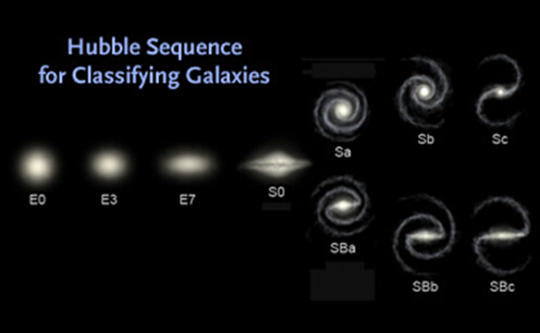 在哈勃的星系分類中,包括外觀從圓形E0到橢圓形E7的橢圓星系,橢圓星系只有核球,沒有旋臂;用S代表具有渦旋結(jié)構(gòu)的星系。渦旋星系又分為 a、b、c三種次型:Sa型中心區(qū)大,稀疏地分布著緊卷旋臂;Sb型中心區(qū)較小,旋臂較大并較開展;Sc型中心區(qū)為小亮核,旋臂大而松弛。 哈勃認(rèn)為,有些星系中央有棒狀結(jié)構(gòu),有些則沒有:SBa到SBc代表有中央棒狀結(jié)構(gòu)的渦旋星系,Sa到Sc是中央沒有棒狀結(jié)構(gòu)的渦旋星系。