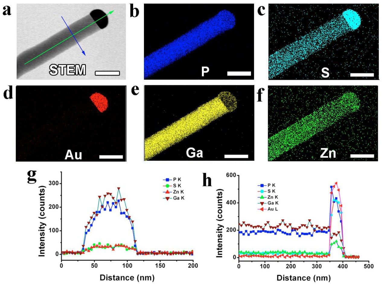 圖1、(GaP)x(ZnS)1-x納米線 (a) STEM照片及(b-f)各元素成分空間分布圖;(g)納米線徑向及(h)軸向線掃描結(jié)果
