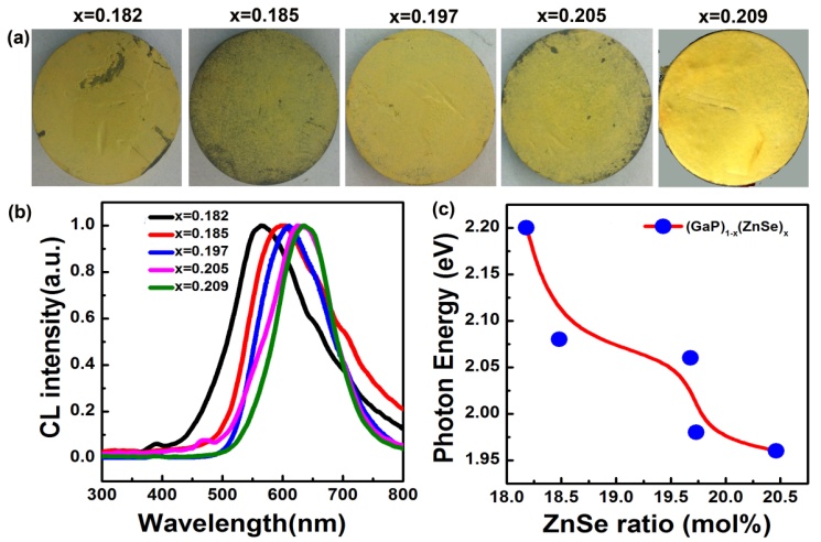 圖2、(a)不同名義成分(GaP)1-x(ZnSe)x納米線光學(xué)照片;(b,c) (GaP)1-x(ZnSe)x納米線發(fā)光波長(zhǎng)、帶隙寬度與成分間的關(guān)系