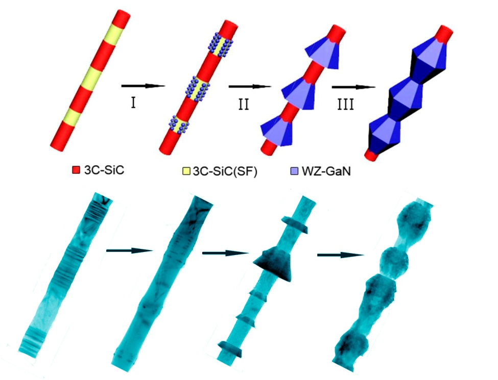 最近,他們同材料特種制備與加工研究部張勁松研究員和姜春海研究員合作,以SiC納米線做模板,充分利用立方3C-SiC納米線層錯(cuò)區(qū)域表面能高的特點(diǎn)來誘導(dǎo)六方GaN在3C-SiC缺陷區(qū)域的優(yōu)先形核,成功地制備出立方碳化硅和六方氮化鎵的異質(zhì)結(jié)納米結(jié)構(gòu)(3C-SiC/WZ-GaN)。進(jìn)一步控制不同階段生長(zhǎng)過程,可以在SiC納米線表面獲得周期性分布的GaN六棱錐及3C-SiC/WZ-GaN核殼等形貌多變的異質(zhì)結(jié)納米結(jié)構(gòu)。這些具有獨(dú)特結(jié)構(gòu)和功能的半導(dǎo)體異質(zhì)結(jié)納米材料將為構(gòu)建新型光電納米器件如場(chǎng)效應(yīng)管、光電探測(cè)器提供理想的模型材料。相關(guān)結(jié)果全文正式在線發(fā)表在美國化學(xué)會(huì)期刊納米快報(bào)Nano Letters 2015, 15, 7837?7846 (DOI: 10.1021/acs.nanolett.5b02454)