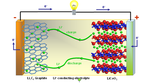 充電時,外界電流從負極流向正極,相應(yīng)地鋰離子從LiCoO2 中脫嵌,經(jīng)過電解液,透過隔膜,到達負極,嵌入負極的石墨中。放電時,鋰離子從石墨脫插,經(jīng)過電解液和多孔隔膜后,最終插入到正極材料中,相應(yīng)地電流從正極經(jīng)外界負載流向負極。