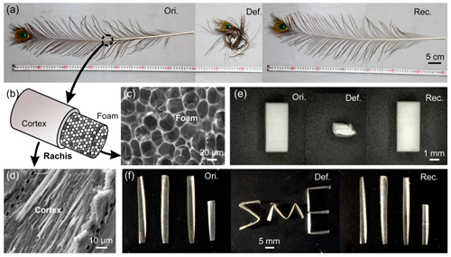 圖2:孔雀羽毛及其組成部分在水合作用下的形狀記憶效應(yīng)
