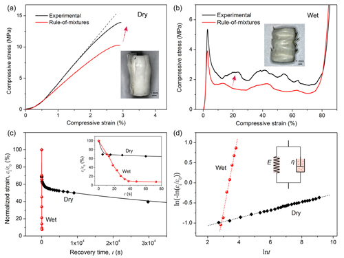 圖3:孔雀尾部覆羽羽軸在干、濕狀態(tài)下的壓縮應(yīng)力-應(yīng)變曲線以及形狀回復(fù)的動力學過程