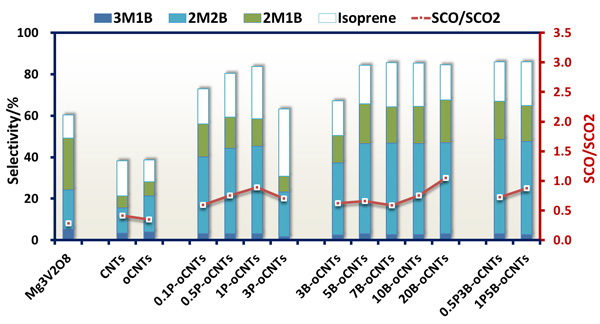 圖1 磷、硼改性碳納米管在異戊烷氧化脫氫反應中產(chǎn)物分布變化
