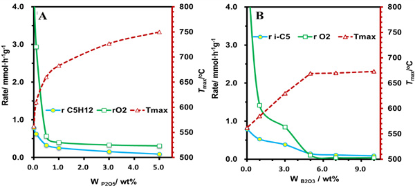 圖2 磷(A)、硼(B)改性碳納米管抗氧化溫度及在異戊烷氧化脫氫反應中反應速率變化