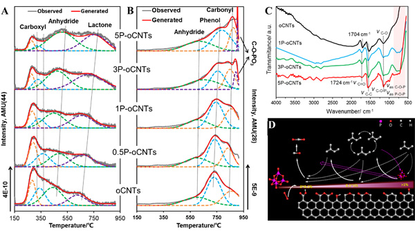 Chem.Commum.,2013,49,8151 )。具有較大原子半徑的磷原子不進入碳納米管骨架,但具有空p軌道的磷原子對未成對電子具有容納能力,可對碳表面缺陷/邊緣和氧官能團的富余電子進行有效控制。隨著磷含量持續(xù)增加,磷改性碳納米管在異戊烷氧化脫氫反應中的烯烴選擇性呈現(xiàn)先增加后降低的火山型分布(圖1),同時磷改性碳納米管抗氧化溫度的升高、以及在異戊烷氧化脫氫反應中反應速率的下降,也呈現(xiàn)先急后緩的對應關(guān)系(圖2A)。結(jié)合程序升溫脫附(TPD,圖3 A, B)、全反射紅外光譜(ATR-IR,圖3C)以及動力學測試,揭示了磷改性碳納米管催化性能的微觀機理(圖3D):磷首先抑制表面缺陷和邊緣對分子氧的活化,導致碳納米管抗氧化溫度的迅速升高,在異戊烷氧化脫氫反應中:分子氧和烷烴消耗速率迅速下降,過度氧化減少且烯烴選擇性提升2倍,超過金屬催化劑V-Mg-O;磷含量持續(xù)增加,碳表面氧官能團與磷形成磷酸酯結(jié)構(gòu)(C-O-PO
