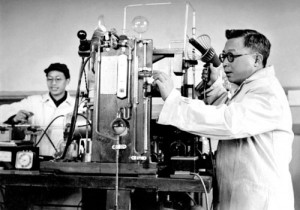 50年代末李薰(右)在實(shí)驗(yàn)室指導(dǎo)定氫實(shí)驗(yàn)