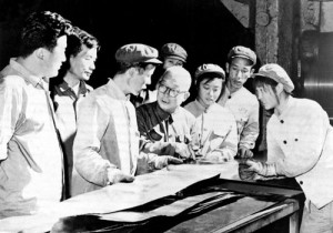 1972年8月李薰在沈陽814廠與技術(shù)人員討論鉬合金的質(zhì)量問題,這是我國第一顆返回式地面人造衛(wèi)星的蒙皮料,由金屬所與814廠合作完成