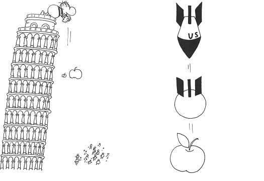 (左:伽利略也喜歡扔蘋(píng)果。右:伊拉克人民不要飛彈要蘋(píng)果。)